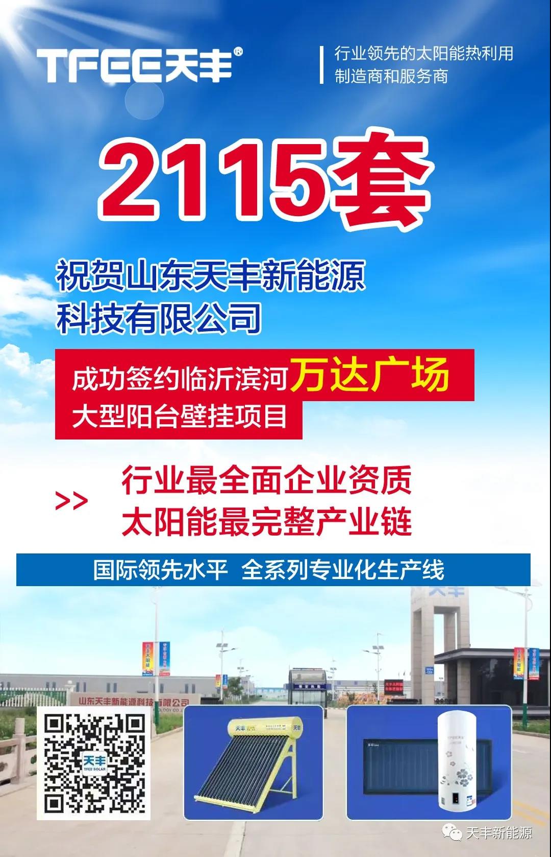 近日,天豐新能源工程部再傳捷報,通過與各品牌的激烈角逐,一舉斬獲臨沂濱河萬達廣場大型陽臺壁掛工程項目,陽臺壁掛太陽能熱水器數量達2115套,為近20座高層住宅提供舒適熱水,這將成為天豐在樓盤配套陽臺壁掛工程領域的又一經典力作。