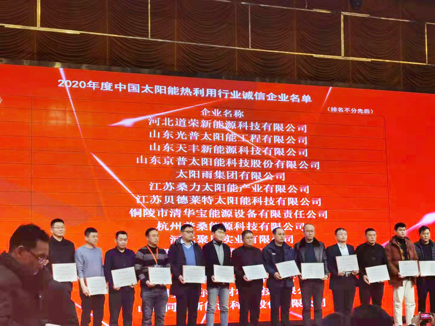12月8日,2020年中國太陽能熱利用行業年會在邢臺召開,山東天豐新能源科技有限公司受邀參加本次會議,在會上,天豐新能源再度蟬聯“中國太陽能熱利用行業誠信企業”稱號,并獲頒榮譽證書。